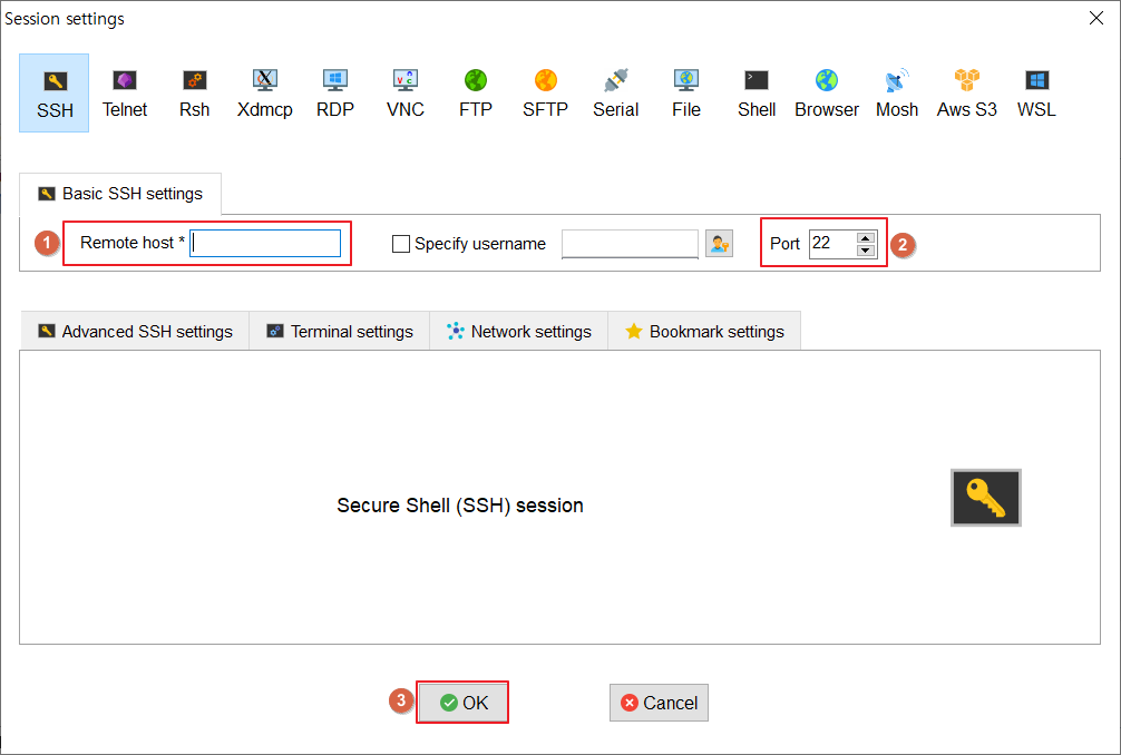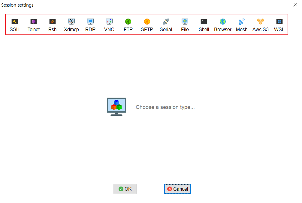 연결 종류 : SSH, Telnet, Rsh, Xdmcp, RDP, VNC, FTP, SFTP, Serial, File, Shell, Browser, Mosh, Aws S3, WSL이 있습니다.
