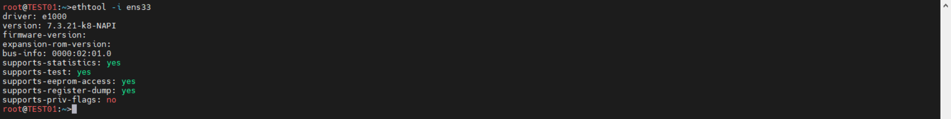 | root@TEST01:~>ethtool -i ens33 driver: e1000 version: 7.3.21-k8-NAPI firmware-version: expansion-rom-version: bus-info: 0000:02:01.0 supports-statistics: yes supports-test: yes supports-eeprom-access: yes supports-register-dump: yes supports-priv-flags: no root@TEST01:~> |