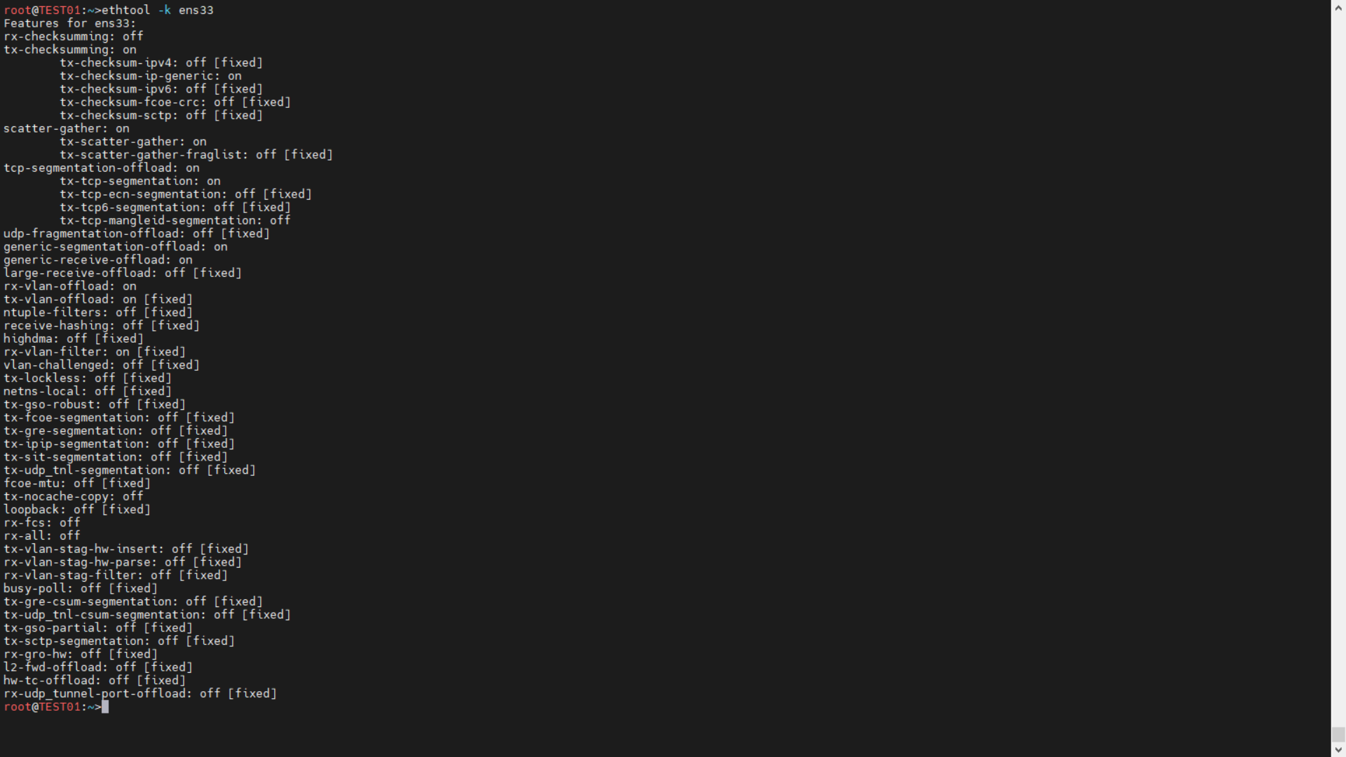 | root@TEST01:~>ethtool -k ens33 Features for ens33: rx-checksumming: off tx-checksumming: on tx-checksum-ipv4: off [fixed] tx-checksum-ip-generic: on tx-checksum-ipv6: off [fixed] tx-checksum-fcoe-crc: off [fixed] tx-checksum-sctp: off [fixed] scatter-gather: on tx-scatter-gather: on tx-scatter-gather-fraglist: off [fixed] tcp-segmentation-offload: on tx-tcp-segmentation: on tx-tcp-ecn-segmentation: off [fixed] tx-tcp6-segmentation: off [fixed] tx-tcp-mangleid-segmentation: off udp-fragmentation-offload: off [fixed] generic-segmentation-offload: on generic-receive-offload: on large-receive-offload: off [fixed] rx-vlan-offload: on tx-vlan-offload: on [fixed] ntuple-filters: off [fixed] receive-hashing: off [fixed] highdma: off [fixed] rx-vlan-filter: on [fixed] vlan-challenged: off [fixed] tx-lockless: off [fixed] netns-local: off [fixed] tx-gso-robust: off [fixed] tx-fcoe-segmentation: off [fixed] tx-gre-segmentation: off [fixed] tx-ipip-segmentation: off [fixed] tx-sit-segmentation: off [fixed] tx-udp_tnl-segmentation: off [fixed] fcoe-mtu: off [fixed] tx-nocache-copy: off loopback: off [fixed] rx-fcs: off rx-all: off tx-vlan-stag-hw-insert: off [fixed] rx-vlan-stag-hw-parse: off [fixed] rx-vlan-stag-filter: off [fixed] busy-poll: off [fixed] tx-gre-csum-segmentation: off [fixed] tx-udp_tnl-csum-segmentation: off [fixed] tx-gso-partial: off [fixed] tx-sctp-segmentation: off [fixed] rx-gro-hw: off [fixed] l2-fwd-offload: off [fixed] hw-tc-offload: off [fixed] rx-udp_tunnel-port-offload: off [fixed] |