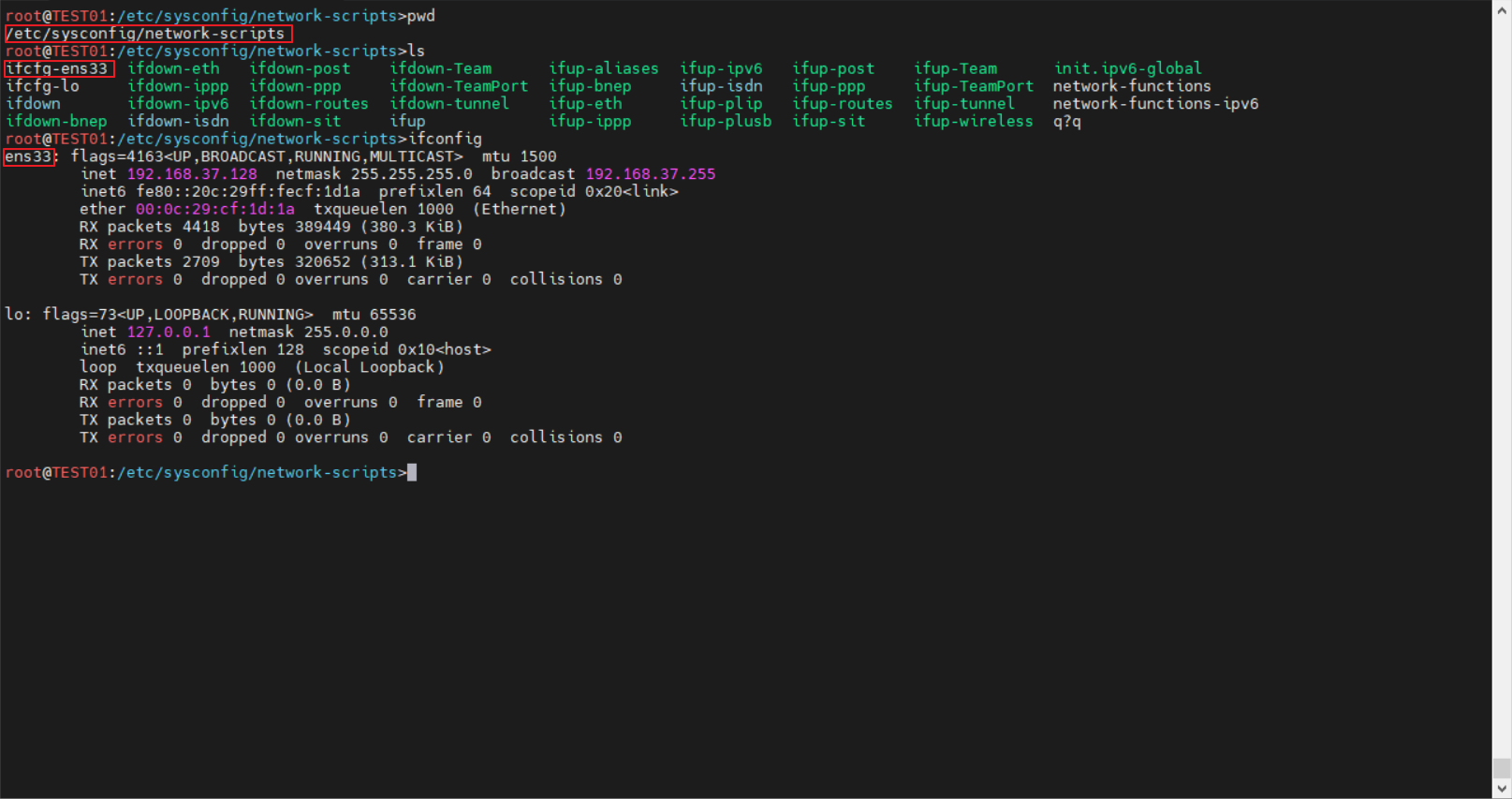 | root@TEST01:/etc/sysconfig/network-scripts>ifconfig ens33: flags=4163<UP,BROADCAST,RUNNING,MULTICAST> mtu 1500 inet 192.168.37.128 netmask 255.255.255.0 broadcast 192.168.37.255 inet6 fe80::20c:29ff:fecf:1d1a prefixlen 64 scopeid 0x20<link> ether 00:0c:29:cf:1d:1a txqueuelen 1000 (Ethernet) RX packets 4456 bytes 392555 (383.3 KiB) RX errors 0 dropped 0 overruns 0 frame 0 TX packets 2735 bytes 323154 (315.5 KiB) TX errors 0 dropped 0 overruns 0 carrier 0 collisions 0 |