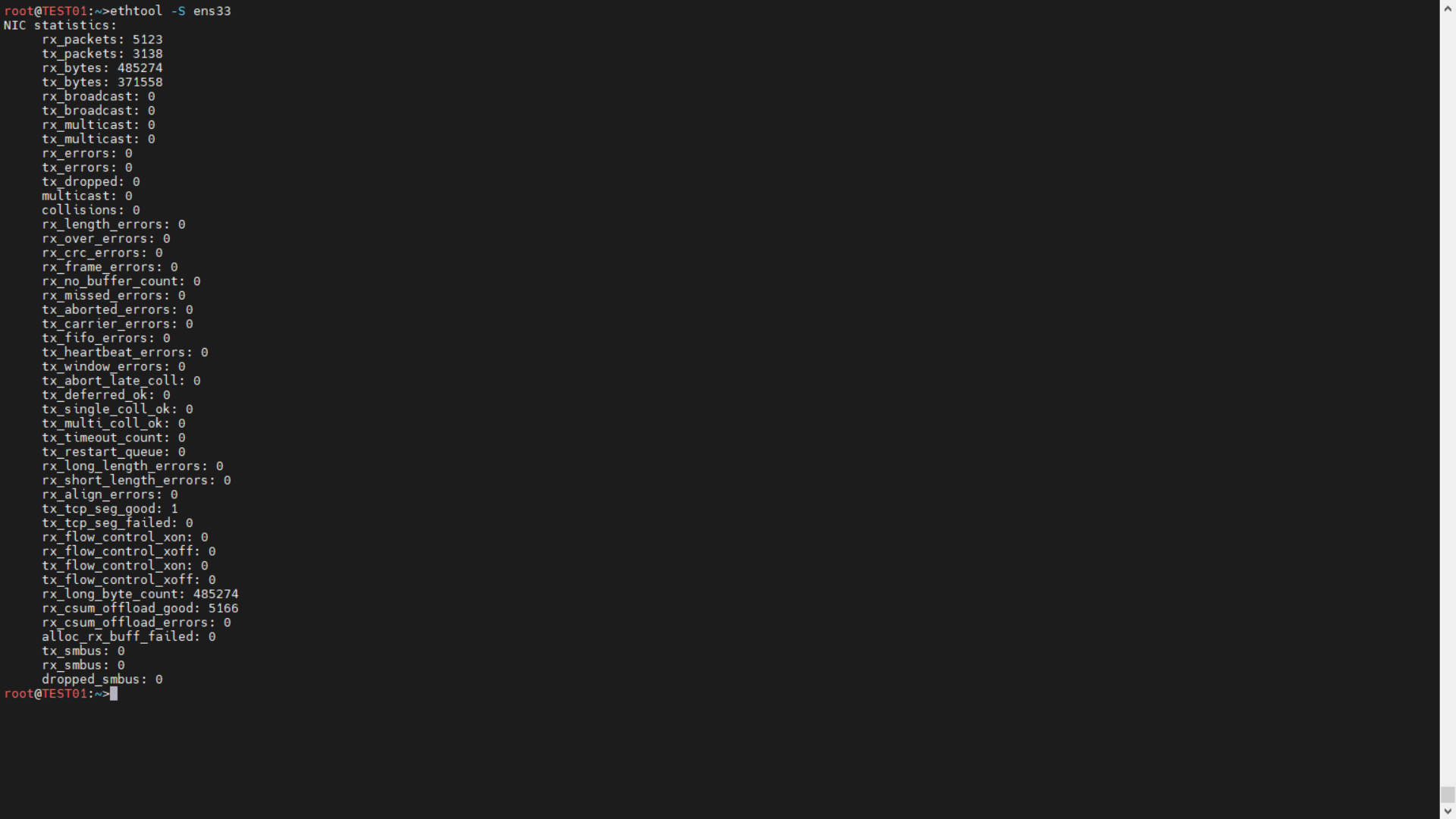 | root@TEST01:~>ethtool -S ens33 NIC statistics: rx_packets: 5123 tx_packets: 3138 rx_bytes: 485274 tx_bytes: 371558 rx_broadcast: 0 tx_broadcast: 0 rx_multicast: 0 tx_multicast: 0 rx_errors: 0 tx_errors: 0 tx_dropped: 0 multicast: 0 collisions: 0 rx_length_errors: 0 rx_over_errors: 0 rx_crc_errors: 0 rx_frame_errors: 0 rx_no_buffer_count: 0 rx_missed_errors: 0 tx_aborted_errors: 0 tx_carrier_errors: 0 tx_fifo_errors: 0 tx_heartbeat_errors: 0 tx_window_errors: 0 tx_abort_late_coll: 0 tx_deferred_ok: 0 tx_single_coll_ok: 0 tx_multi_coll_ok: 0 tx_timeout_count: 0 tx_restart_queue: 0 rx_long_length_errors: 0 rx_short_length_errors: 0 rx_align_errors: 0 tx_tcp_seg_good: 1 tx_tcp_seg_failed: 0 rx_flow_control_xon: 0 rx_flow_control_xoff: 0 tx_flow_control_xon: 0 tx_flow_control_xoff: 0 rx_long_byte_count: 485274 rx_csum_offload_good: 5166 rx_csum_offload_errors: 0 alloc_rx_buff_failed: 0 tx_smbus: 0 rx_smbus: 0 dropped_smbus: 0 root@TEST01:~> |