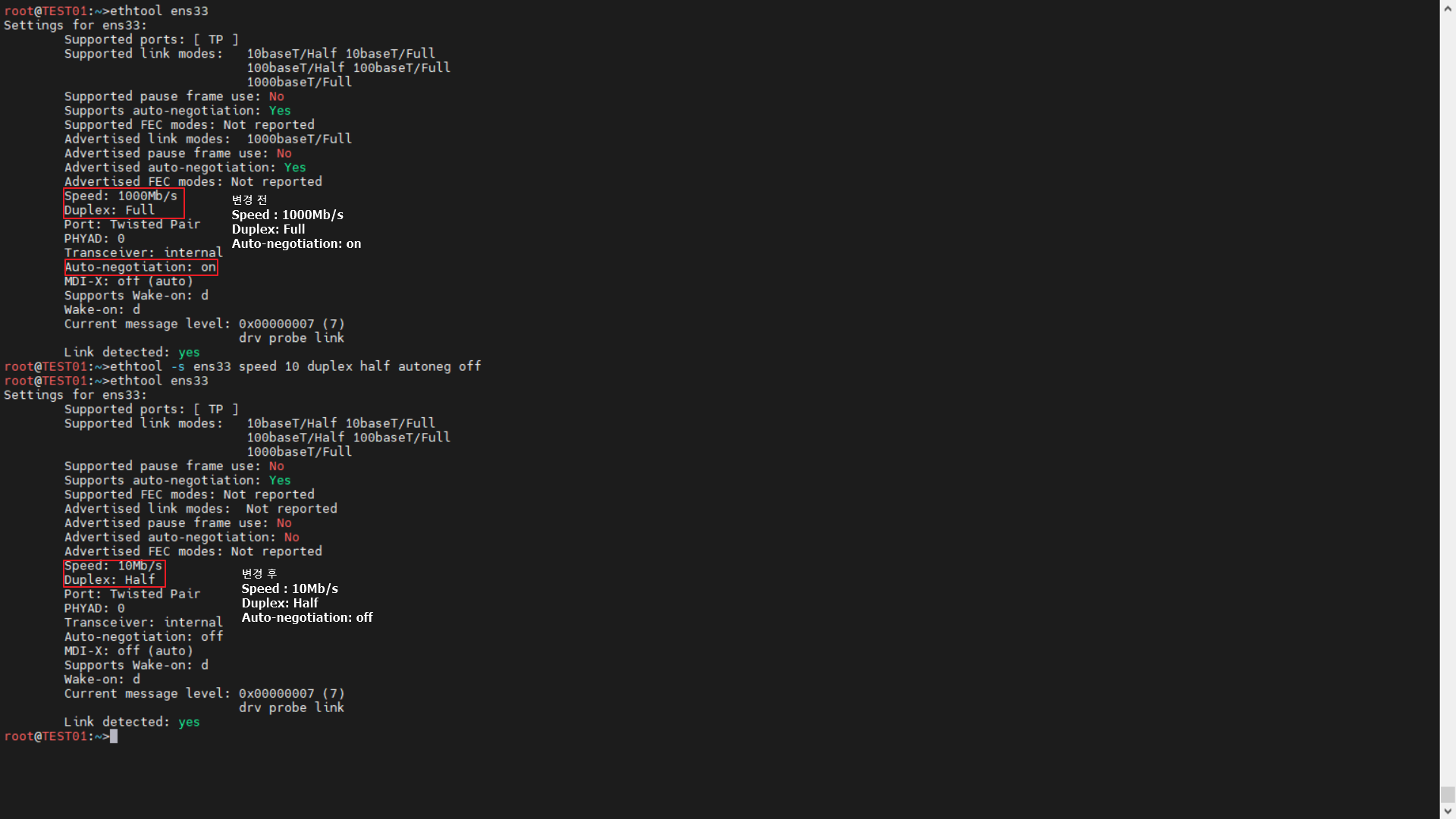 | 명령어 : ethtool -S [네트워크 디바이스] speed [10/100/1000/10000] duplex [full/half] autoneg [on/off] |