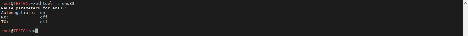 | root@TEST01:~>ethtool -a ens33 Pause parameters for ens33: Autonegotiate: on RX: off TX: off root@TEST01:~> |