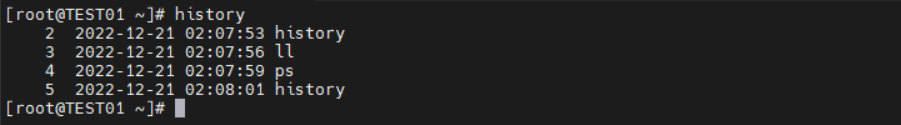 | [root@TEST01 ~]# history 2 2022-12-21 02:07:53 history 3 2022-12-21 02:07:56 ll 4 2022-12-21 02:07:59 ps 5 2022-12-21 02:08:01 history |