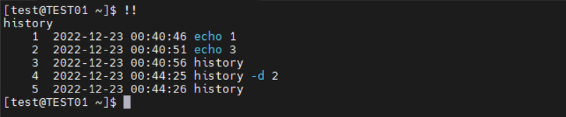 | [test@TEST01 ~]$ !! history 1 2022-12-23 00:40:46 echo 1 2 2022-12-23 00:40:51 echo 3 3 2022-12-23 00:40:56 history 4 2022-12-23 00:44:25 history -d 2 5 2022-12-23 00:44:26 history [test@TEST01 ~]$ |