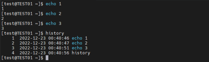 | [test@TEST01 ~]$ echo 1 1 [test@TEST01 ~]$ echo 2 2 [test@TEST01 ~]$ echo 3 3 [test@TEST01 ~]$ history 1 2022-12-23 00:40:46 echo 1 2 2022-12-23 00:40:47 echo 2 3 2022-12-23 00:40:51 echo 3 4 2022-12-23 00:40:56 history [test@TEST01 ~]$ |