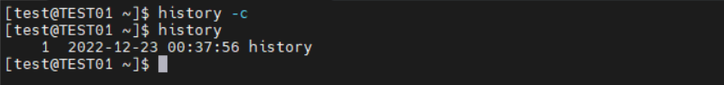 | [test@TEST01 ~]$ history -c [test@TEST01 ~]$ history 1 2022-12-23 00:37:56 history [test@TEST01 ~]$ |