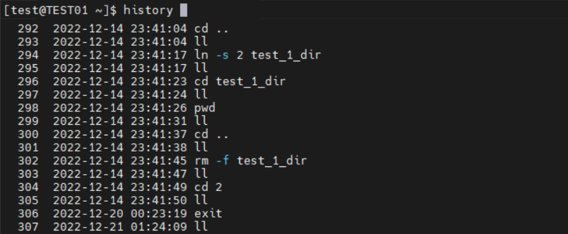 | [root@TEST01 ~]# history 292 2022-12-14 23:41:04 cd .. 293 2022-12-14 23:41:04 ll 294 2022-12-14 23:41:17 ln -s 2 test_1_dir 295 2022-12-14 23:41:17 ll 296 2022-12-14 23:41:23 cd test_1_dir 297 2022-12-14 23:41:24 ll 298 2022-12-14 23:41:26 pwd 299 2022-12-14 23:41:31 ll 300 2022-12-14 23:41:37 cd .. 301 2022-12-14 23:41:38 ll 302 2022-12-14 23:41:45 rm -f test_1_dir 303 2022-12-14 23:41:47 ll 304 2022-12-14 23:41:49 cd 2 305 2022-12-14 23:41:50 ll 306 2022-12-20 00:23:19 exit 307 2022-12-21 01:24:09 ll |