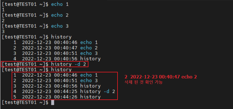 | [test@TEST01 ~]$ echo 1 1 [test@TEST01 ~]$ echo 2 2 [test@TEST01 ~]$ echo 3 3 [test@TEST01 ~]$ history 1 2022-12-23 00:40:46 echo 1 2 2022-12-23 00:40:47 echo 2 3 2022-12-23 00:40:51 echo 3 4 2022-12-23 00:40:56 history [test@TEST01 ~]$ history -d 2 [test@TEST01 ~]$ history 1 2022-12-23 00:40:46 echo 1 2 2022-12-23 00:40:51 echo 3 3 2022-12-23 00:40:56 history 4 2022-12-23 00:44:25 history -d 2 5 2022-12-23 00:44:26 history [test@TEST01 ~]$ |