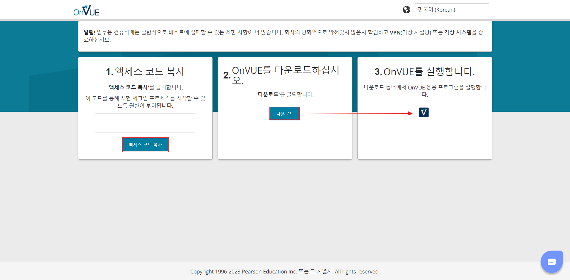 액세스 코드 복사 → 다운로드 → OnVUE 실행