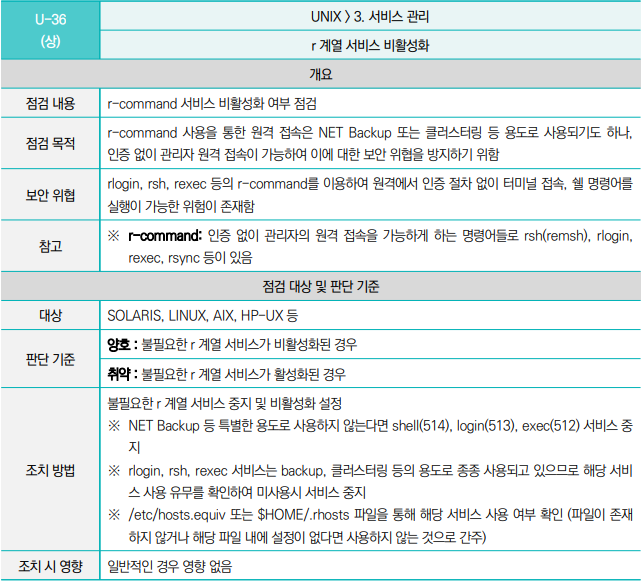 - 신뢰 관계 파일 주의: 서비스 비활성화와 함께 hosts.equiv, .rhosts 파일 내 설정 내용도 함께 점검하여 비인가자의 패스워드 없는 로그인을 원천 차단해야 합니다.